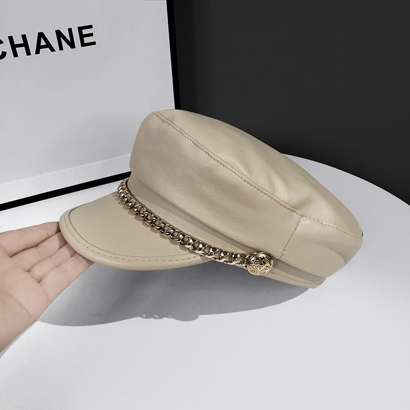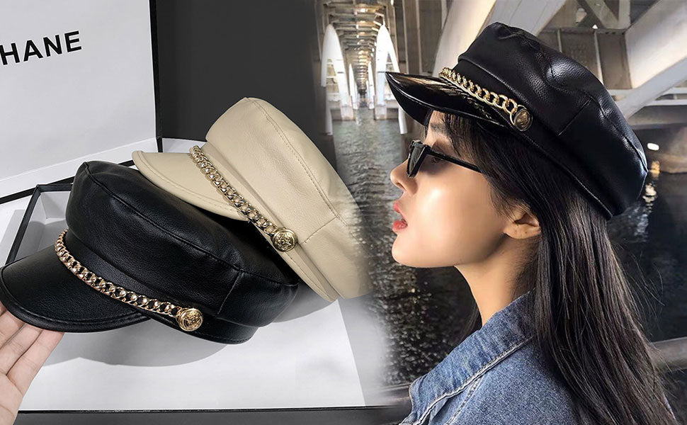 The leather newsboy hats women's is equipped with a gold chain design on the cap, which increases the overall texture. The fine sewing process ensures that the leather fits the head highly. The women's newsboy cap is matched with black leather material, which adds a retro and elegant atmosphere, making the overall shape both modern fashion and retro charm.